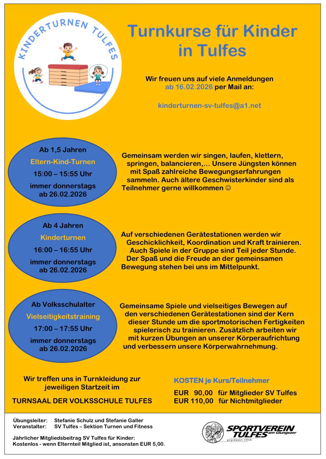 Neben unseren 3 Turnkursen haben wir auch kostenlose Einheiten zu Kraft & Ausdauer, Kids Aerobic